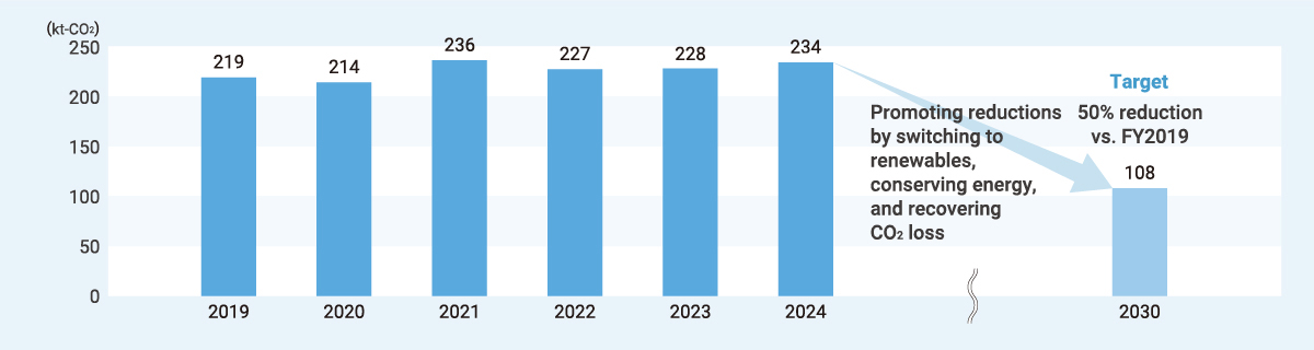 The Iwatani Group’s domestic GHG emissions in FY2024 totaled 234 kt, up 6 kt from the previous fiscal year. To date we have advanced various initiatives to reduce emissions, including installing solar panels at industrial gas manufacturing facilities and LPG centers and switching business sites to green power. While these initiatives have generated some results, emissions increased due to higher plant utilization rates accompanying business growth.