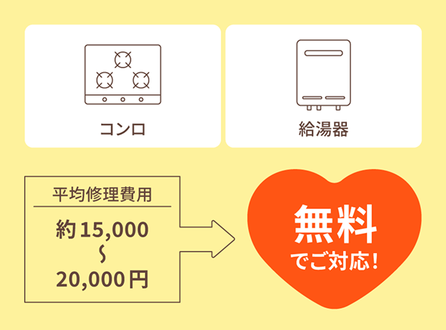 お使いのガスコンロや給湯器で、「お湯が出ない…」「コンロが点火しづらい」などトラブルが起こったときには、修理にかかる費用を無料でお受けいただくことができます。
