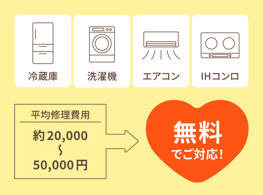 ガス機器以外にも、冷蔵庫や洗濯機、エアコンなどの家電でトラブルが起こったときでも、修理にかかる費用を無料でお受けいただくことができます。