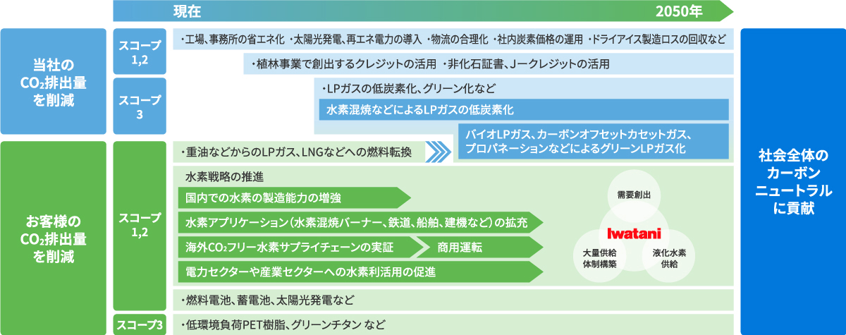 また、2050年のカーボンニュートラルに向けて、当社の事業活動におけるCO2排出量の削減を進めるとともに水素事業などの拡大により、社会全体のCO2削減に貢献していきます。