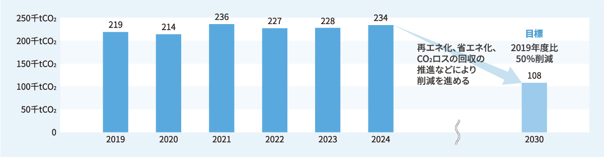 当社グループ(国内)の2024年度におけるGHG排出量は234千tとなり、前年度比で6千tの増加となりました。これまで、産業ガス製造拠点やLPGセンターへの太陽光パネルの設置、事業所における電力のグリーン化など、各種削減施策に取り組んでまいりました。これらの取り組みによる一定の効果は表れているものの、事業成長に伴うプラントの稼働増により、結果として排出量は増加しています。